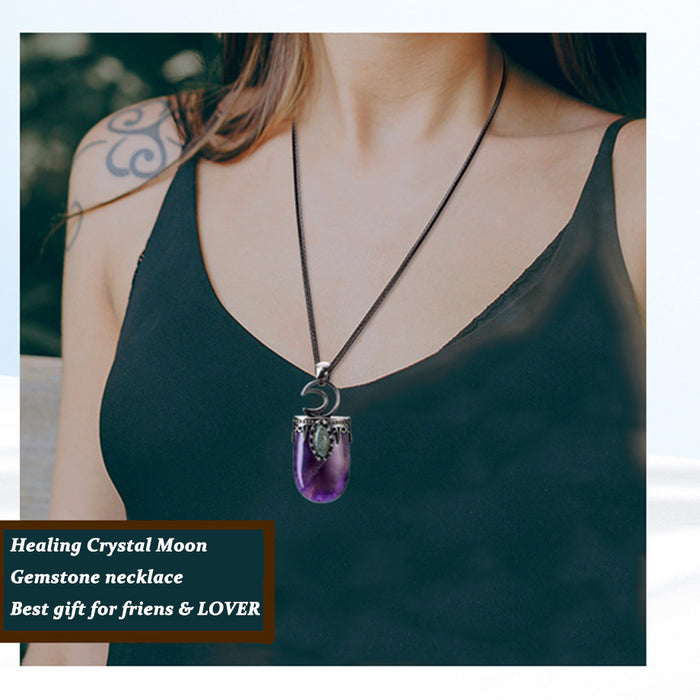 Make a statement with this one-of-a-kind Natural Stone Crystal Antique Pendant Necklace. This necklace features a mesmerizing purple and pink quartz surrounded by a meticulously crafted antique silver crown and crescent moon charm. Crafted with natural stone and quality crystal, this pendant necklace is sure to be a treasured piece of jewelry for years to come. Not only is it an eye-catching piece of art, but the combination of color and beauty makes it the perfect accessory for any occasion. Whether you're dressing up for a formal event or just trying to add some excitement to your casual ensemble, this stunning necklace will be sure to add the perfect pop! Give this special gift as a token of your appreciation or present it to yourself as a reminder that you are wildly empowered and beautiful - because you deserve it! Get your Natural Stone Crystal Antique Pendant Necklace today.
