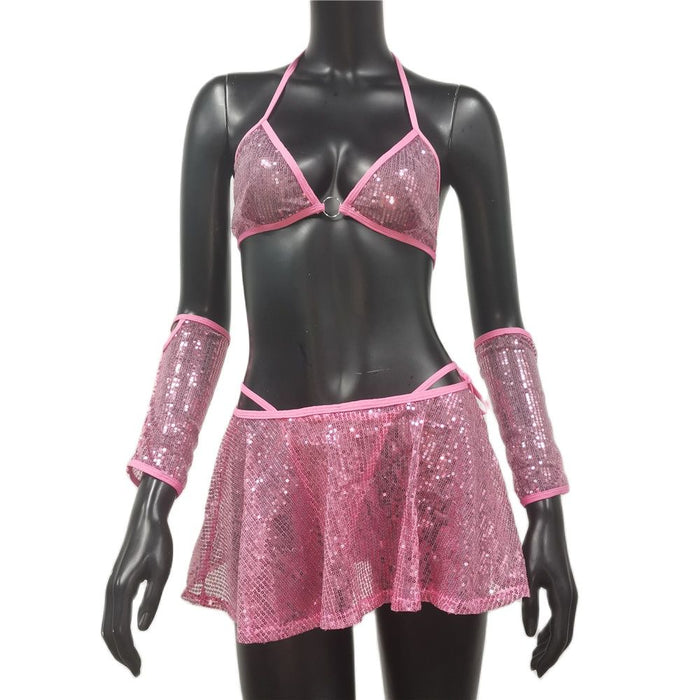 Introducing the Clubwear Party Matching Set, a game-changing addition to any outfit. This high-quality set is made from lightweight glitter sequins material and features a stylish backless crop top bra, mini skirt, thong, gloves, and other accessories. Perfect for making an entrance at parties or festivals, you'll be sure to turn heads all night long in this gorgeous matching set. With an eye-catching design that complements your unique style, you'll make a statement wherever you go. Whether you're dancing all night or feeling fabulous in the sun, it can handle whatever your day throws at it. We've also taken care of your comfort with anti-wrinkle fabric and breathable material to ensure optimal movement when you're out on the town. Get ready to hit up the hottest parties knowing that you look your absolute best!