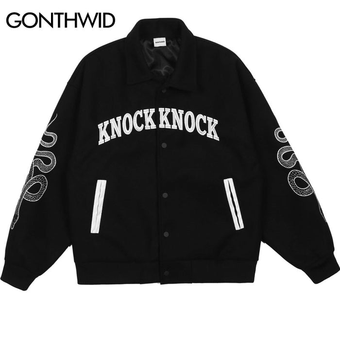 Introducing the Embroidery Snake Varsity Jacket, a modern iteration of the classic varsity jacket. This stylish piece showcases contemporary design details but retains its timeless appeal. Crafted from high-quality fabric and featuring a comfortable fit, this statement piece is as flattering as it gets. The Hip Hop Bomber Jacket Streetwear style is further elevated with special embroidery of a snake on the back of the jacket. If you’re looking for something that offers both comfort and iconic streetwear aesthetics, then the Embroidery Snake Varsity Jacket is your answer. In addition to being stylish and fashionable, it’s also lightweight and should fit in perfectly with your existing wardrobe. The Men's Vintage Embroidery Snake Baseball Coat Harajuku Casual Japanese Style ensures absolute comfort even during cold weather or days spent exploring outdoors. So enhance your outfit and make a bold statement - add this classic piece to your must-have items today!